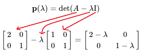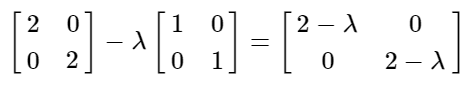 Veámoslo con un ejemplo. Supongamos que tenemos una matriz A de 2x2 con su respectiva matriz de identidad y queremos calcular sus autovalores.