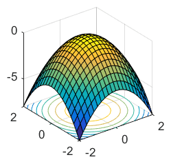 Si se grafica la función f(x, y) y se la mirara desde arriba hacia abajo e isométricamente se vería así:
