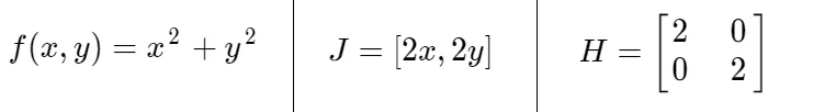 Consideremos otra función 'f(x, y)', su primera derivada 'J' y su matriz Hessiana 'H':
