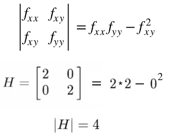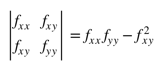 Calculamos su primera derivada y luego calculamos su Hessiano. Una vez calculado el Hessiano, lo usamos para calcular el determinante de acuerdo a la fórmula que tenemos más arriba: