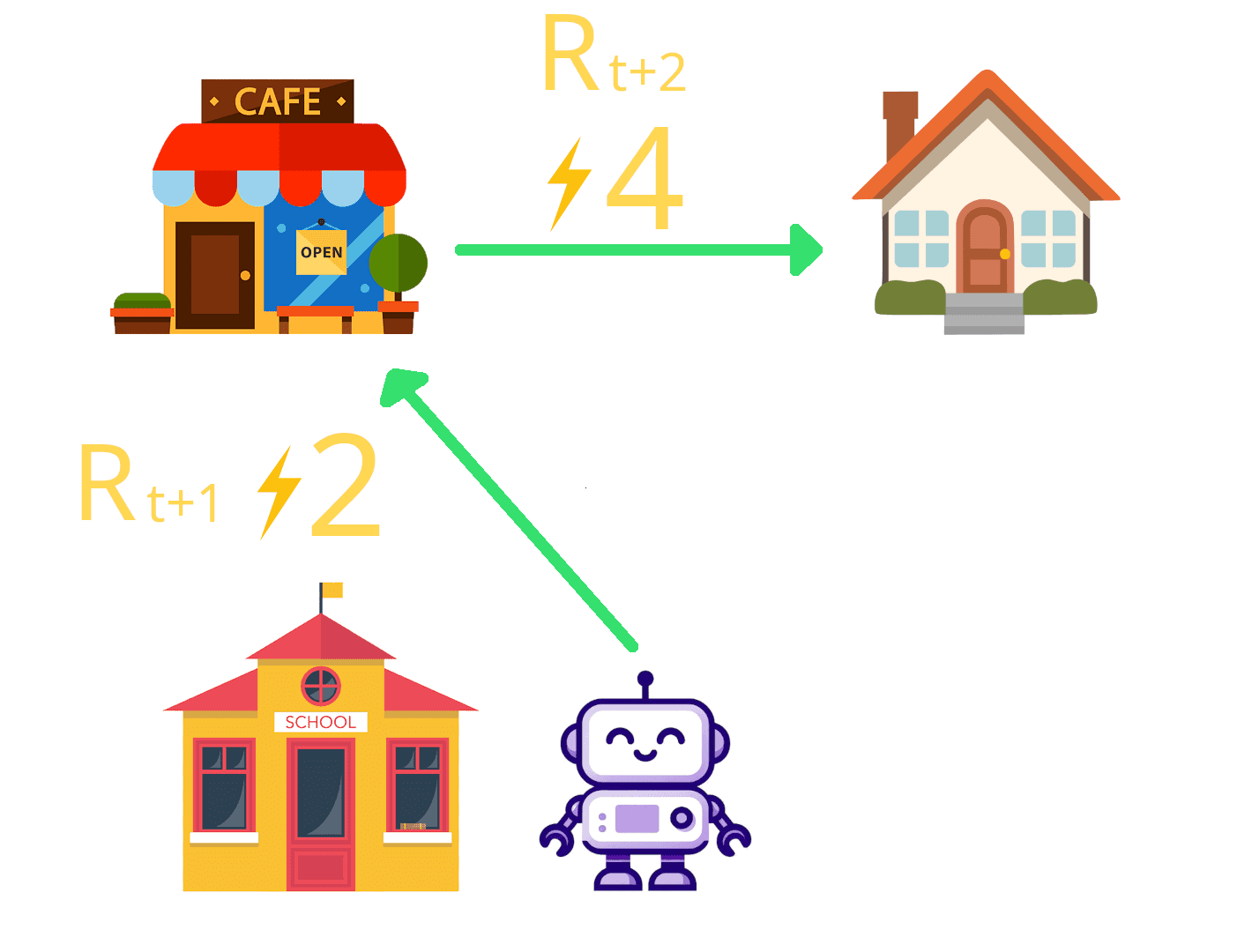 En este caso tenemos dos recompensas la primera es ir al café que nos da dos de energía, es decir y la segunda es ir a casa que nos da 4 de energía, es decir . Armar la formula con estas dos recompensas nos queda esto: Luego reemplazamos el valor de las dos recompensas: Si reemplazamos el 𝛾 por 1 quedaría así: Es decir que nuestra recompensa en el camino más largo es 6 de energía. | En este caso tenemos solo como recompensa, ir a casa que nos da 4 de energía es decir . Armar la formula con estas dos recompensas nos queda esto: Luego reemplazamos el valor de la recompensa: Es decir que nuestra recompensa en el camino más corto es 4 de energía. |