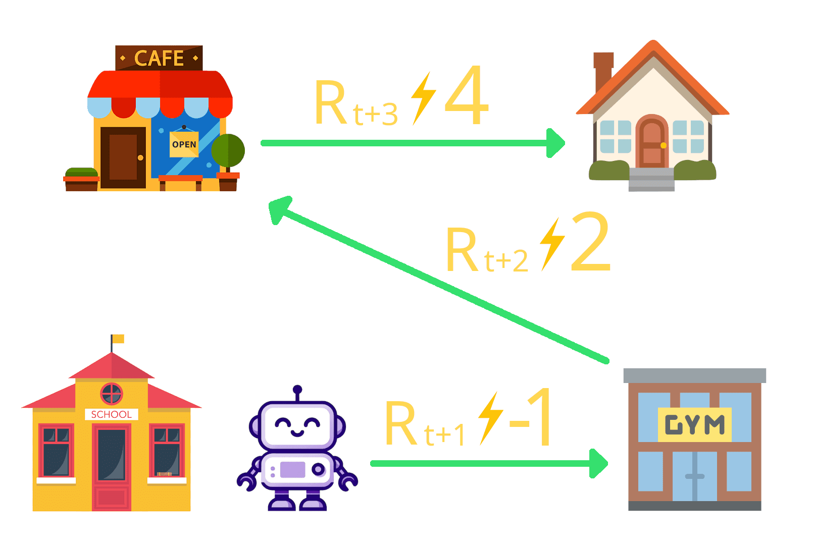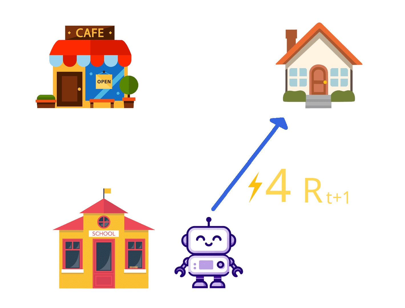 En este caso tenemos dos recompensas la primera es ir al café que nos da dos de energía, es decir y la segunda es ir a casa que nos da 4 de energía es decir . Armar la formula con estas dos recompensas nos queda esto: Luego reemplazamos el valor de las dos recompensas: Si reemplazamos el 𝛾 por 0 quedaría así: Es decir que nuestra recompensa en el camino más largo es 2 de energía. | En este caso tenemos solo como recompensa, ir a casa que nos da 4 de energía, es decir . Armar la formula con estas dos recompensas nos queda esto: Luego reemplazamos el valor de la recompensa: Es decir que nuestra recompensa en el camino más corto es 4 de energía. |
