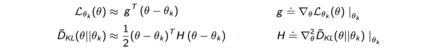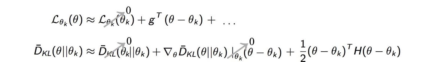 Esto tiene sentido porque sólo necesitamos aproximarnos a la ventaja sustituta localmente cerca de los parámetros de nuestra política actual y los polinomios de Taylor son una muy buena herramienta para aproximar una función alrededor de un punto particular en algún intervalo usando solo términos polinomiales, que son mucho más fáciles de manejar en comparación con otras funciones. Entonces usamos la serie de Taylor para expandir la ventaja sustituta y el término de divergencia KL.