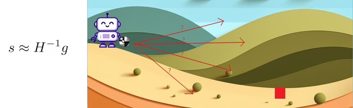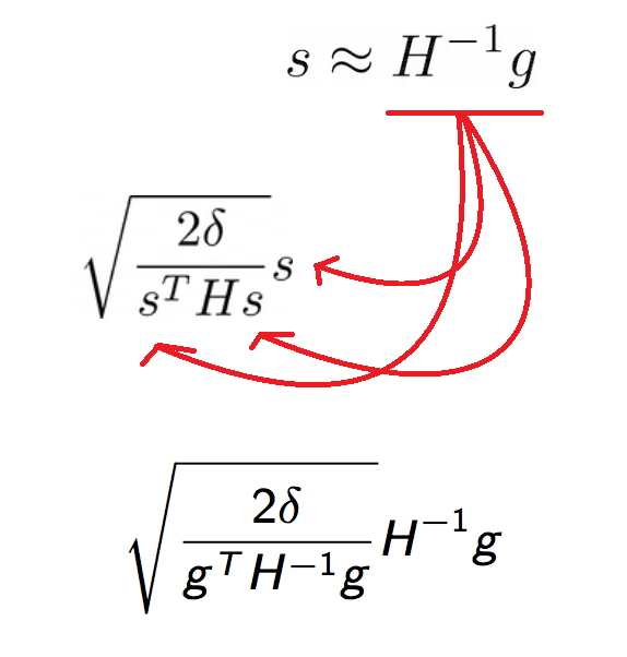 Ahora determinamos la dirección de búsqueda que va a maximizar nuestro objetivo. El termino con el termino . La razón de esto es que representa en qué dirección hay mayor aumento de los cada uno de los parámetros del modelo. Y representa la 'intensidad' con la cual se deben cambiar los parámetros del modelo de acuerdo a Kullback-Leibler. Es decir que significaría 'Dirección del Cambio' por 'Intensidad del Cambio'. Sin embargo hay un problema 😞. Usar la matriz Hessiana directamente podría llevar a problemas, ya que esta matriz puede tener determinantes pequeños o incluso cero en ciertas direcciones, lo que complicaría la inversión de la matriz y podría resultar en pasos de actualización inestables o poco fiables. Al utilizar la inversa de la matriz Hessiana, se busca mitigar estos problemas. La inversa de la matriz Hessiana tiene la propiedad de 'compensar' las regiones donde la matriz Hessiana podría ser inestable o poco informativa. Además, al trabajar con la inversa, se logra controlar el tamaño del paso de manera más efectiva, ya que la inversa puede atenuar o amplificar la magnitud de las actualizaciones dependiendo de la curvatura local. Una vez definido esto, la ecuación nos queda de la siguiente manera: