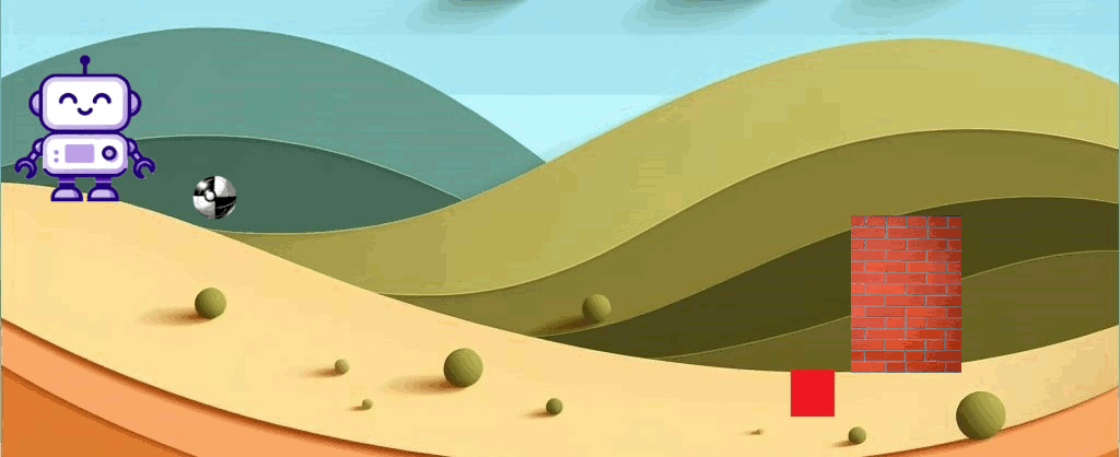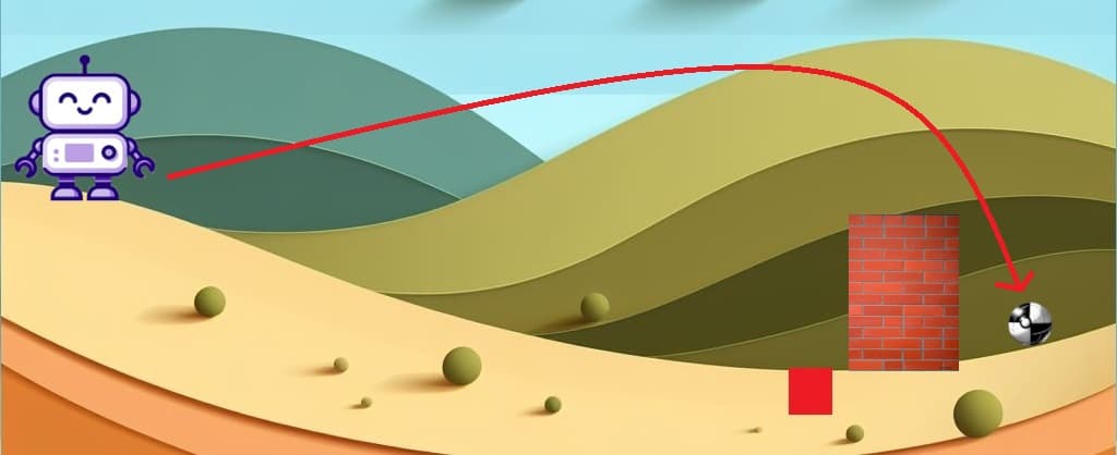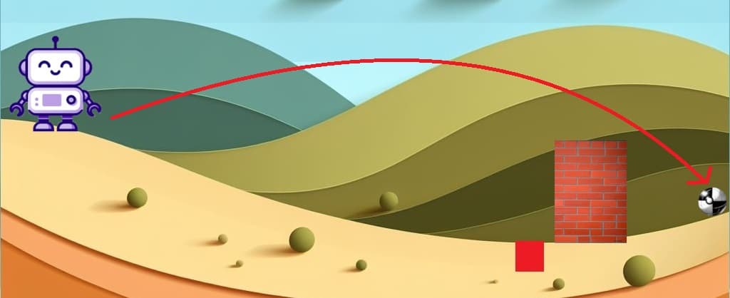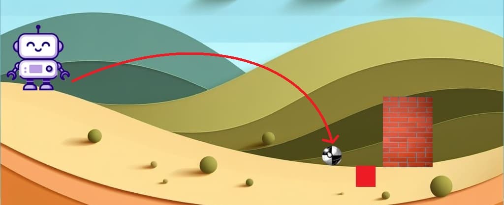 Supongamos que nuestro amigo Aifa decide tirar la pelota trazando una parábola con el fin de meterla en el pozo rojo. Pero lo que termina sucediendo es que la pelota cae adelante del muro. Esto es un error muy grande porque ahora la pelota no va a poder ingresar al pozo de ninguna manera y encima no la va a poder recuperar 😥: