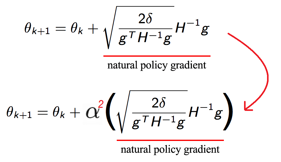 Continuamos esto hasta que cumpla con las condiciones y luego usamos ese paso para realizar una actualización del parámetro de política θ. Es decir, si por ejemplo ahora siguiera sin cumplir las condiciones lo probaríamos multiplicándolo de nuevo por :