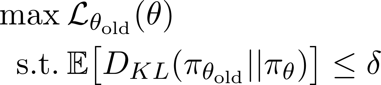 Esta ecuación representa la recompensa estimada. Como la recompensa es un buen indicador del rendimiento del modelo, queremos que nuestra recompensa sea cada vez mayor, por lo que debemos dedicarnos a encontrar cómo cada vez evaluado el modelo, esta funciona arroje un resultado mayor. Es decir que debemos maximizar esta función, pero sin sobrepasar un límite que hemos propuesto de manera arbitraria (región de confianza). En términos matemáticos se puede representar de esta manera: