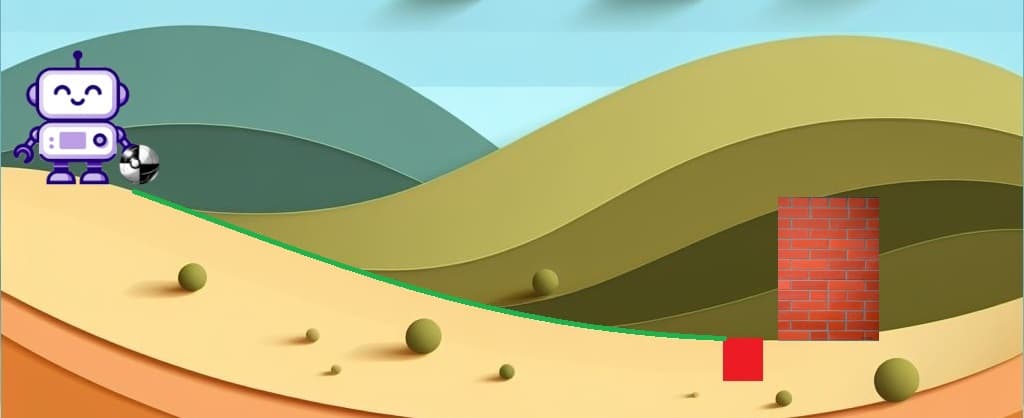 Supongamos que nuestro amigo Aifa decide tirar la pelota trazando una parábola con el fin de meterla en el pozo rojo. Pero lo que termina sucediendo es que la pelota cae adelante del muro. Esto es un error muy grande porque ahora la pelota no va a poder ingresar al pozo de ninguna manera y encima no la va a poder recuperar 😥: